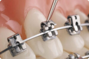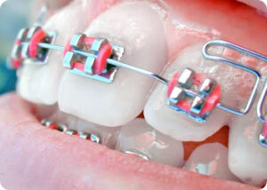 O aparelho convencional utiliza borrachinhas para prender o fio ao braquete.