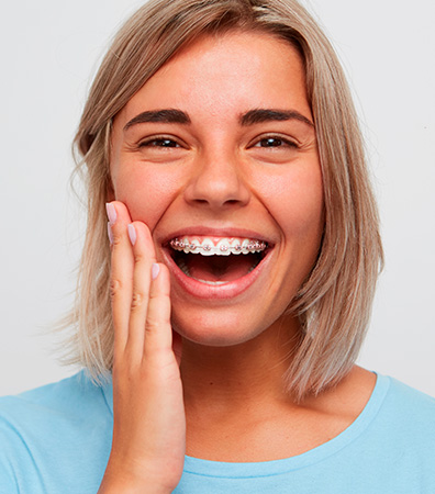 Opção mais discreta, com braquetes na cor do dente, proporcionando um tratamento ortodôntico mais estético.